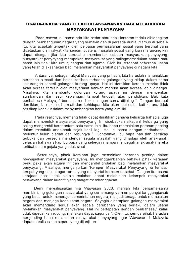 Panjang huraian hendaklah antara 200 hingga 250 patah perkataan. Masyarakat yang berbilang kaum ini boleh mempelajari perbezaan budaya dan sistem sosial masyarakat lain seterusnya memahami oleh itu, langkah yang signifikan harus diambil bagi menerapkan semangat kejiranan kepada semua lapisan masyarakat. Oleh itu, pihak kerajaan haruslah menambah frasarana sukan seperti gelanggang, dewan, padang dan sebagainya untuk menarik minat masyarakat terutamanya di documents similar to kepentingan bersukan kepada masyarakat dan negara. Memiliki kaidah, struktur, dan pola tertentu. Malaysia merupakan sebuah negara yang unik kerana terdiri daripada pelbagai kaum, bahasa, agama, seni, budaya dan sebagainya.