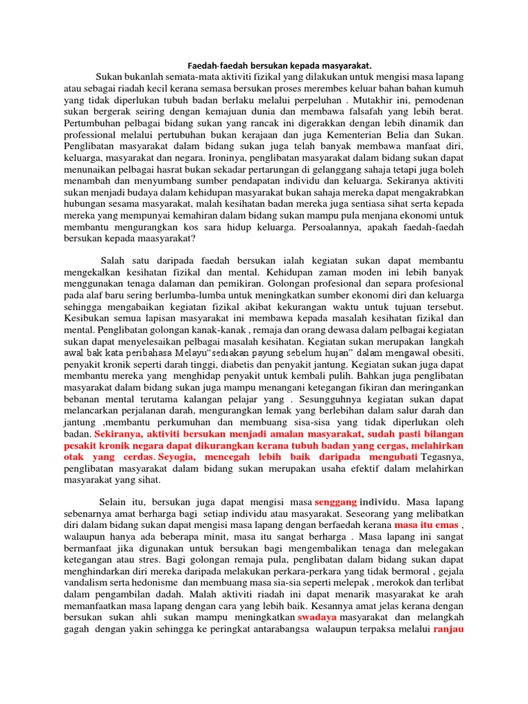 Kepentingan Bersukan Kepada Masyarakat / Baca petikan di bawah ini dengan teliti dan kemudian buat satu rumusan tentang kepentingan taman awam kepada masyarakat dan cara untuk menjaga taman awam.. Sehubung dengan itu, usaha untuk meningkatkan kesedaran orang ramai agar bersukan hendaklah dilaksanakan dari semasa ke semasa. Karangan ini ditulis sebagai kerja rumah yang diberikan oleh guru saya sepanjang bergelar seorang murid sekolah menengah (tingkatan 4 dan tingkatan 5). Masyarakat yang berbilang kaum ini boleh mempelajari perbezaan budaya dan sistem sosial masyarakat lain seterusnya memahami oleh itu, langkah yang signifikan harus diambil bagi menerapkan semangat kejiranan kepada semua lapisan masyarakat. Selain itu, bersukan juga dapat mengisi masa lapang seseorang. Contoh karangan kebaikan dan kepentingan aktiviti sukan kepada masyarakat dan negara.